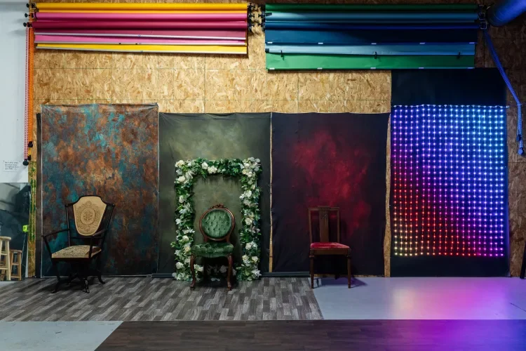 Downstairs, you’ll find the main shooting area featuring nine backdrop rolls, a programmable GoVee LED curtain wall, X-Drop canvas stand, and an extensive selection of canvas backdrops with cinematic tones. A reflection pool is available with advance notice, giving photographers an opportunity to capture editorial, fashion, or fine art work with dramatic visual impact.